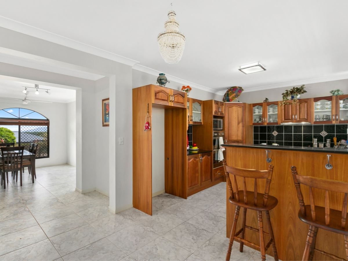 A central, open plan kitchen spreads out to both formal and informal living and dining, including a generous front room with sweeping views. Equiped with stainless steel appliances including a dishwasher, the kitchen also displays stone benchtops, breakfast bar and timber cabinetry.
