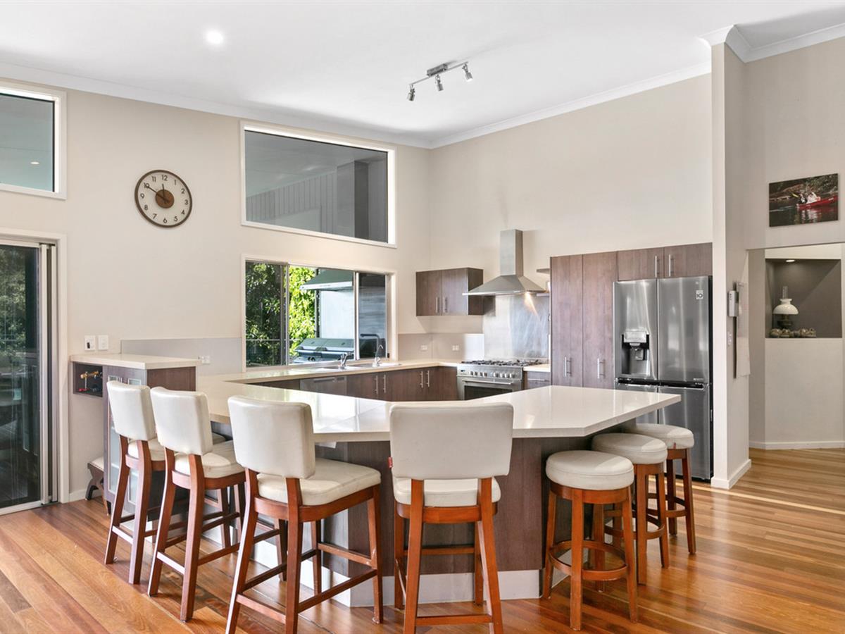 Living and dining is open plan but cleverly set out to break up the zones, while a central kitchen offers stone benchtops, 900mm freestanding stainless steel gas stove and oven, double fridge space, ample storage and a servery to the deck.