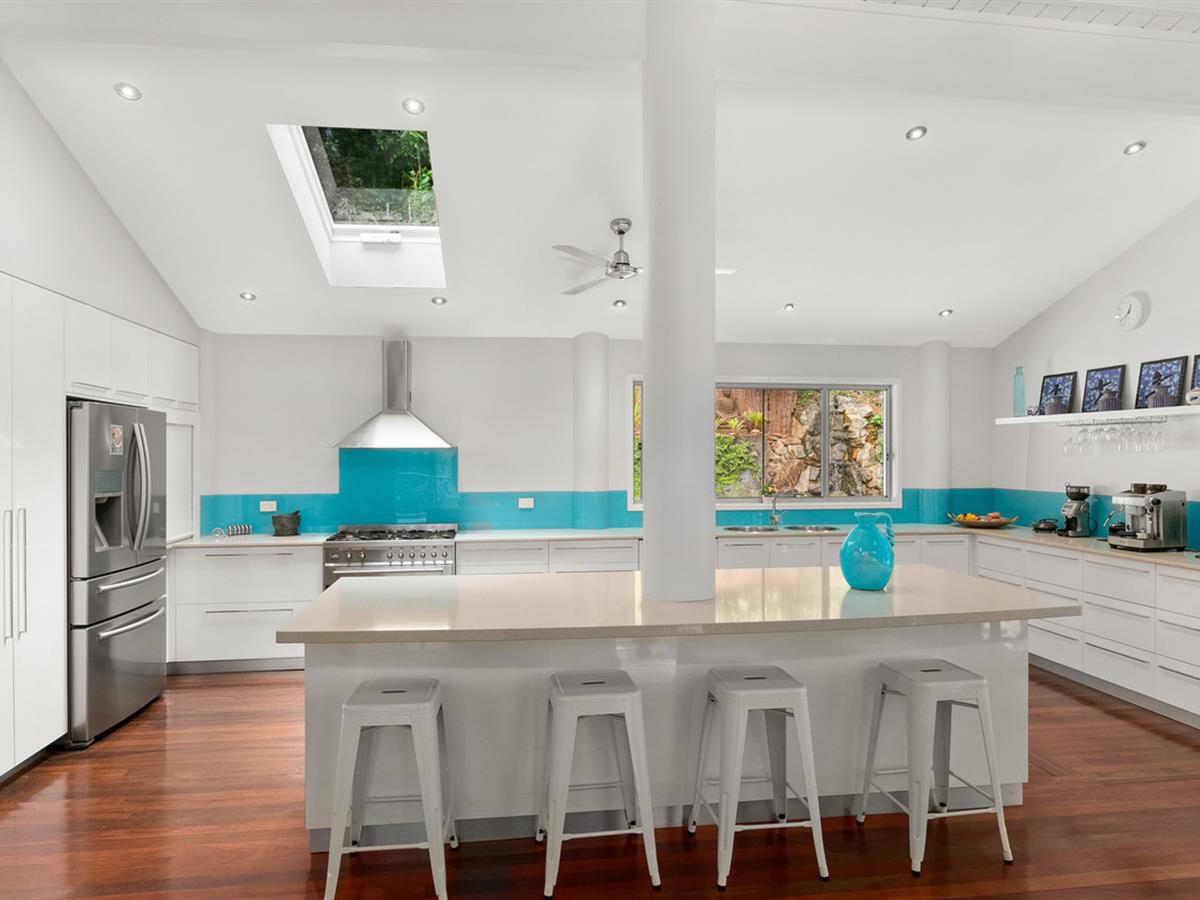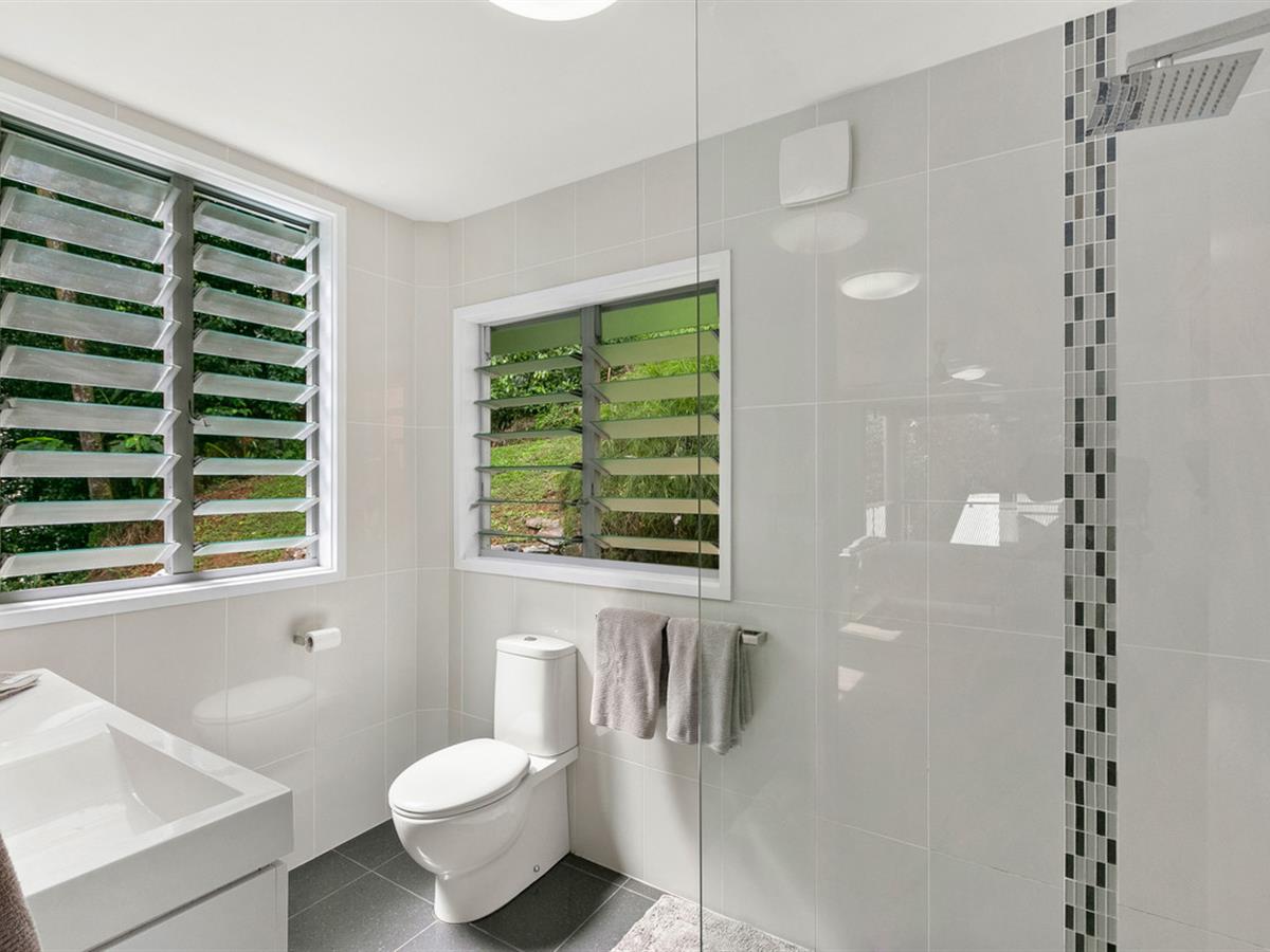 Positioned at the top of the gently curving drive, the main house offers a total of 5 bedrooms and 5 bathrooms across three levels, each open to the views and breezes with ample glasswork inviting an abundance of natural light and scenery.