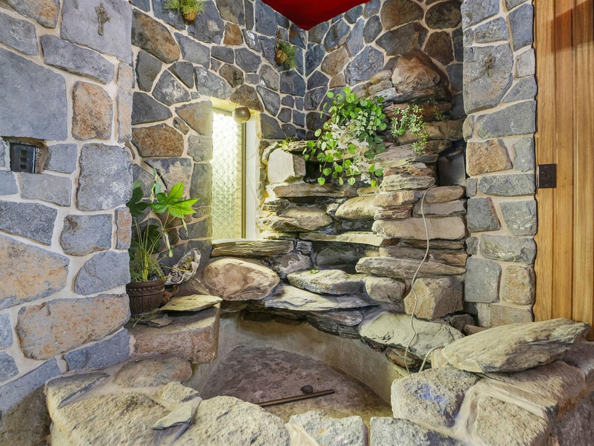 Downstairs currently fits a more commercial bent but could readily be taken in a different direction, with the welcoming atrium with its own slate pond (and carpeted ceiling) opening to a cavernous rumpus room complete with timber panelled walls, slate features and a luxurious bar.