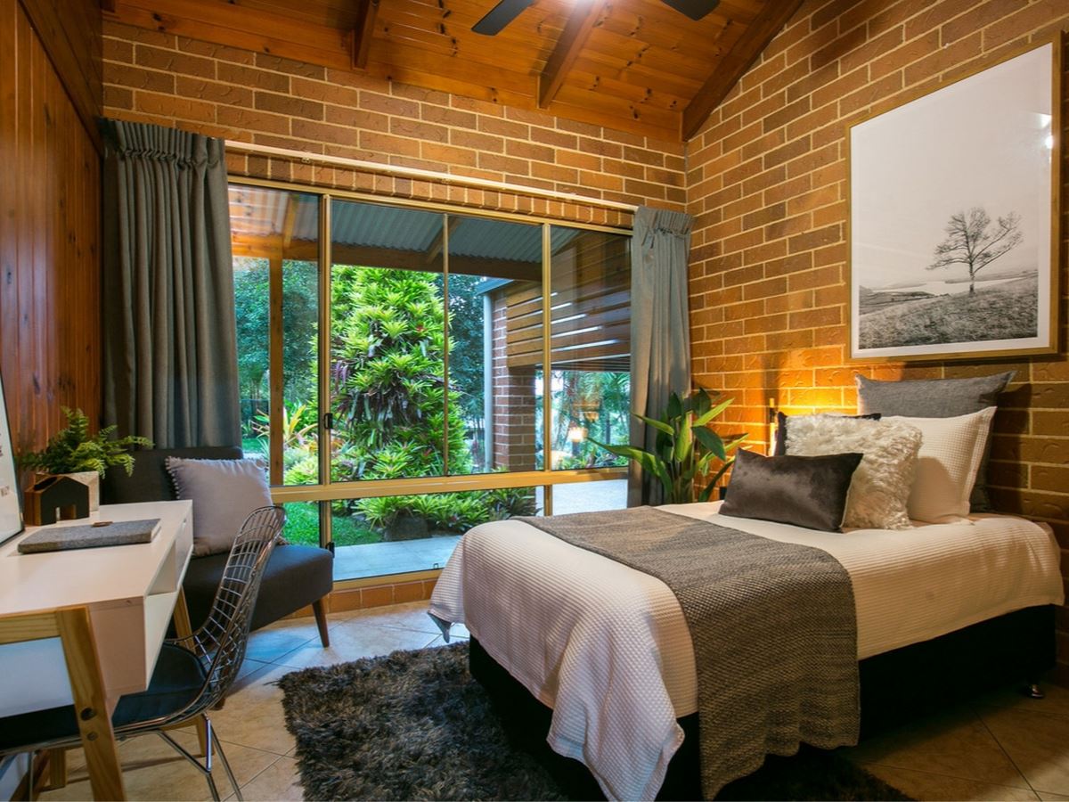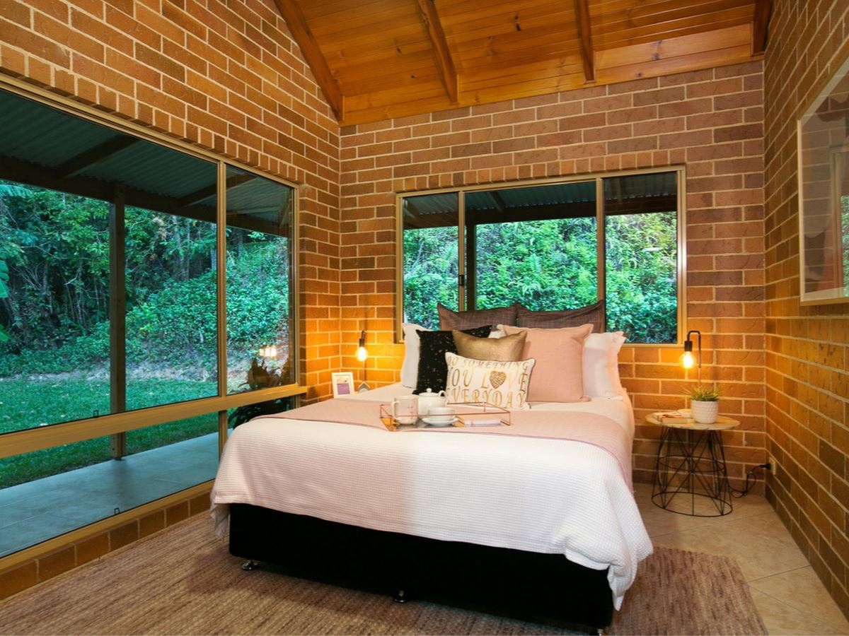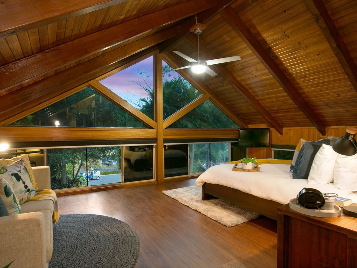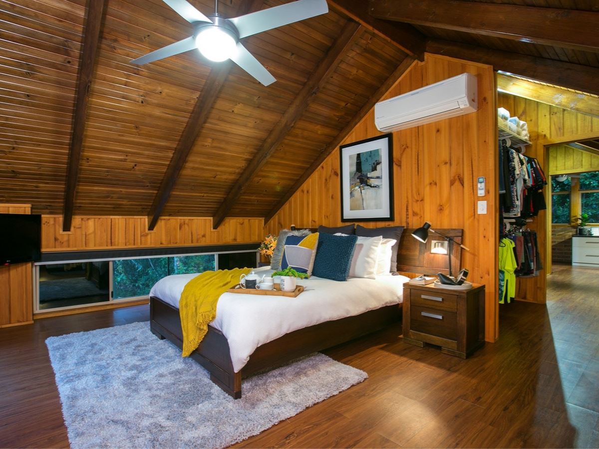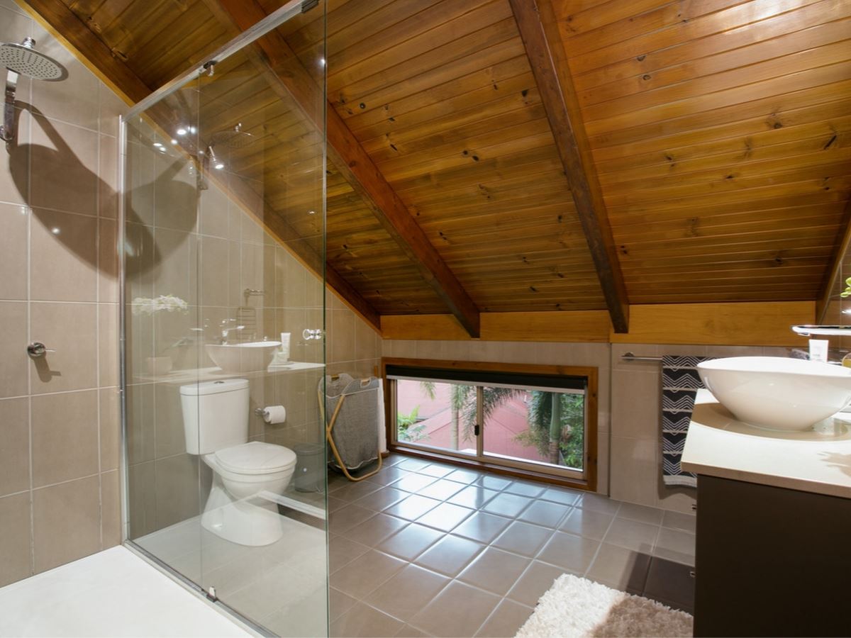 Given the private position, glass has been used in abundance to provide a seamless transition between inside and out and the combination of soaring cathedral style timber ceilings with cool, neutral tiles gives the home a light and airy feel, matched with mountain breezes. Exposed brick construction works well with the timber to provide a different (but comfortable) style, which works well across the home and its multiple living areas.