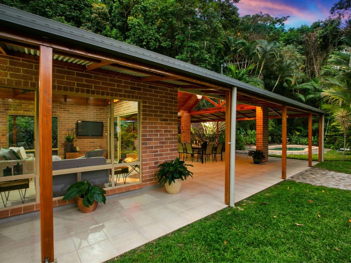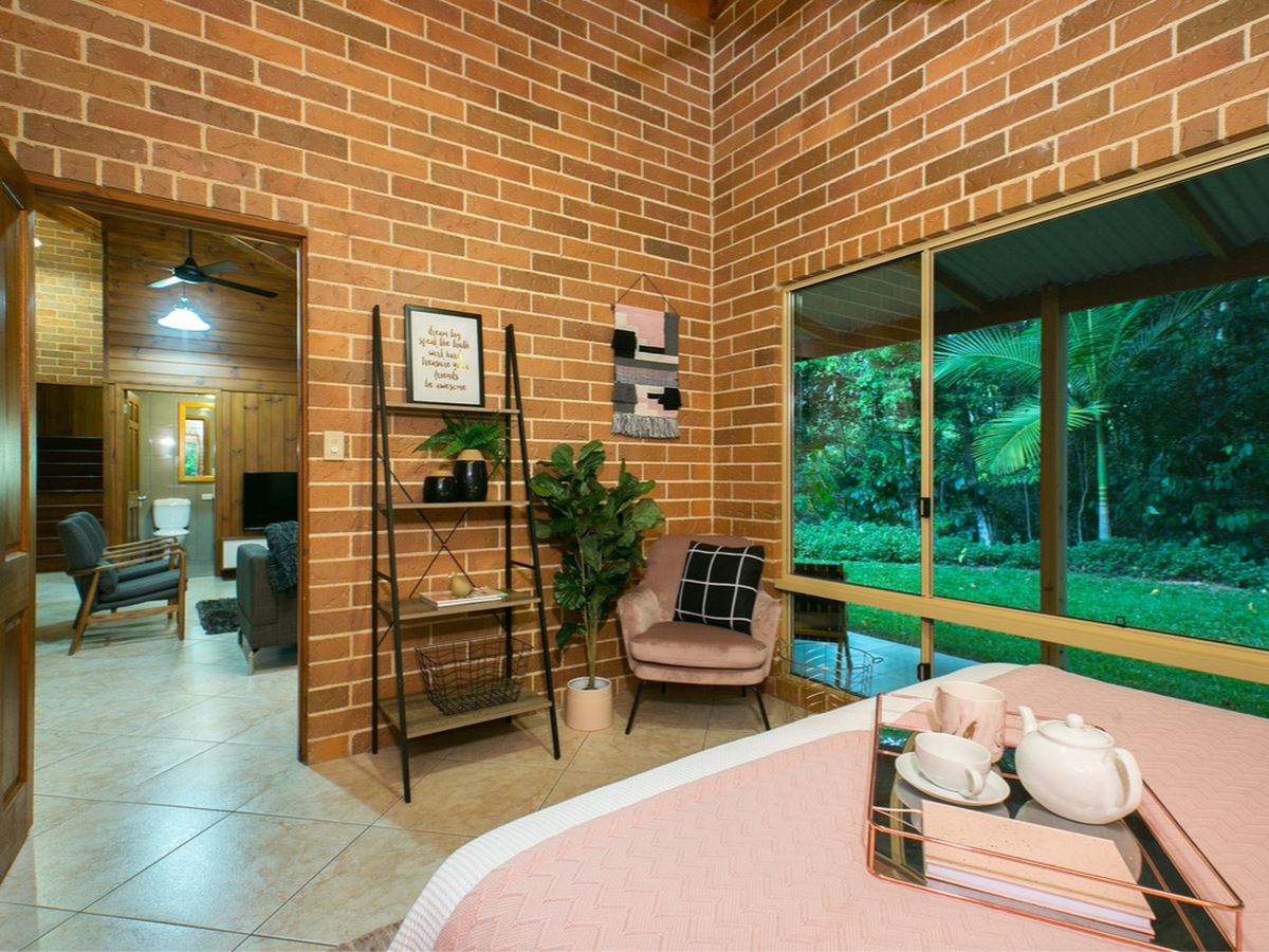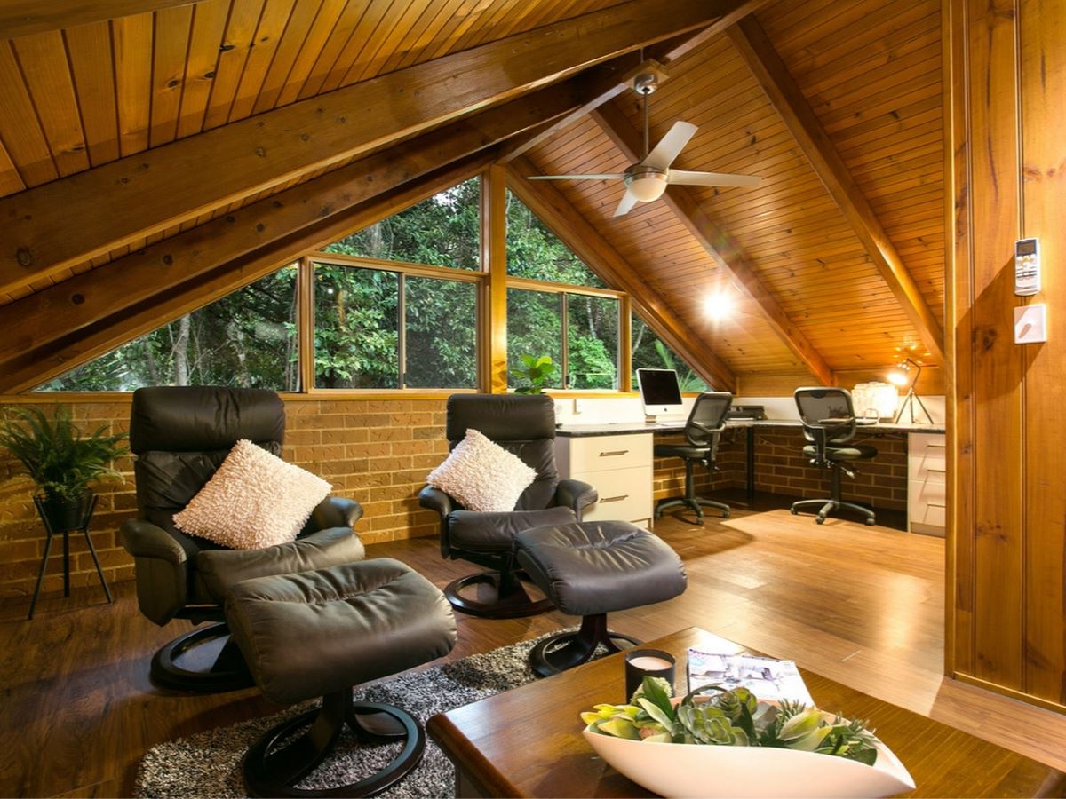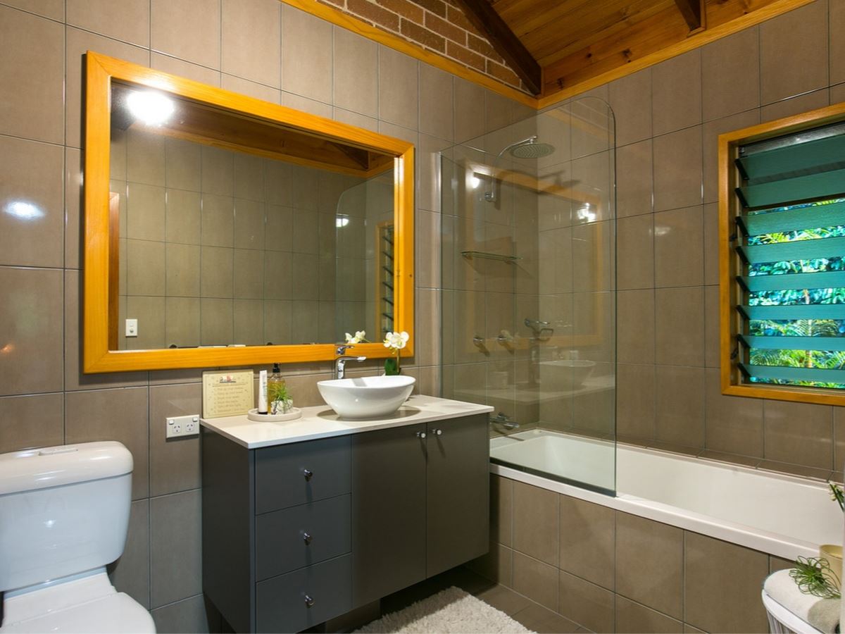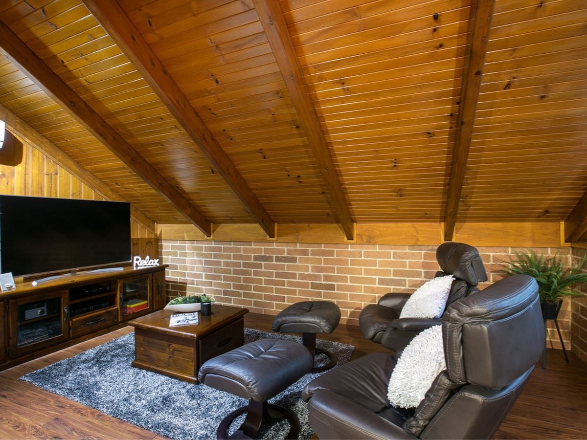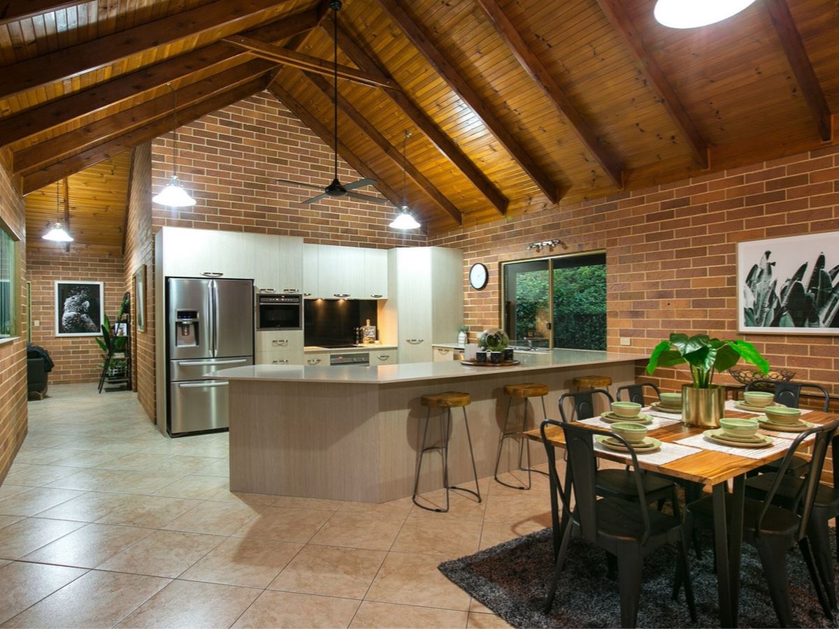 Given the private position, glass has been used in abundance to provide a seamless transition between inside and out and the combination of soaring cathedral style timber ceilings with cool, neutral tiles gives the home a light and airy feel, matched with mountain breezes. Exposed brick construction works well with the timber to provide a different (but comfortable) style, which works well across the home and its multiple living areas.