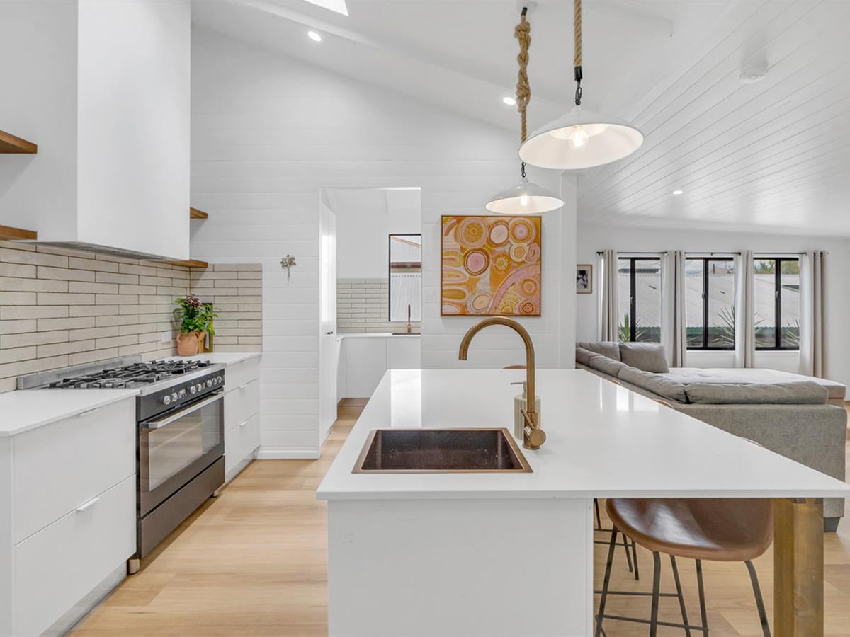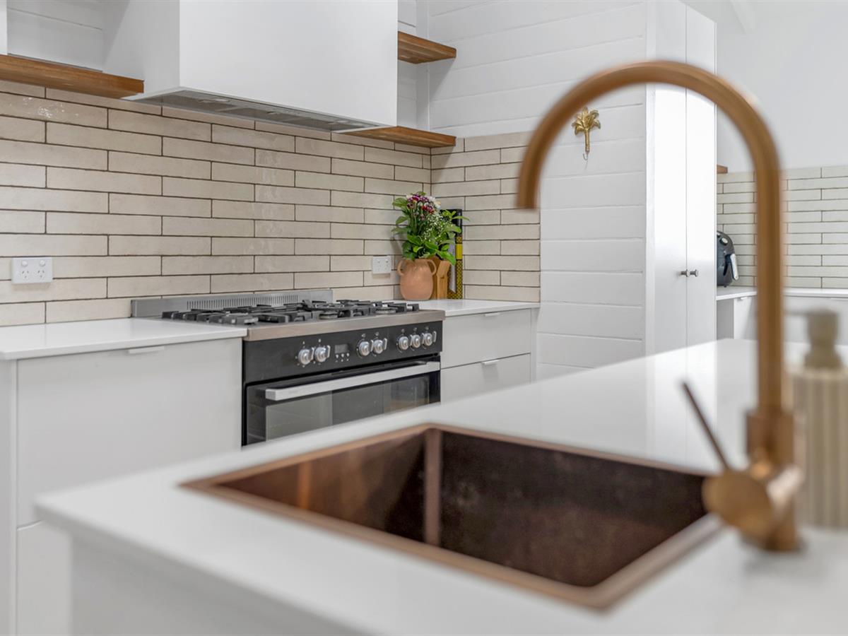 The kitchen is a standout, with stone benchtops and island, brushed copper fixtures (continued in the bathrooms) and 900mm freestanding stove and oven with gas top. Storage and prep space is amply covered, with a butler's pantry keeping everything tucked neatly away.