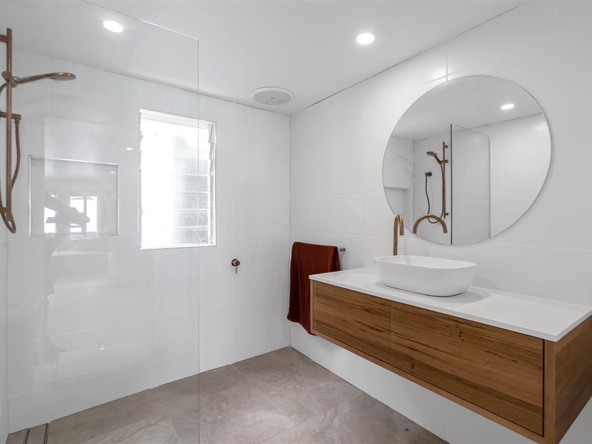 The three main bedrooms are all generous in size, with built-ins to 2, and the master featuring both walk-in-robe and exquisite ensuite with double walk-in-shower and floating vanity. The 4th bedroom is positioned to the rear for guest privacy or a little extra quiet when working from home. The main bathroom is newly completed and offers the same luxurious aesthetic and brushed copper accents.