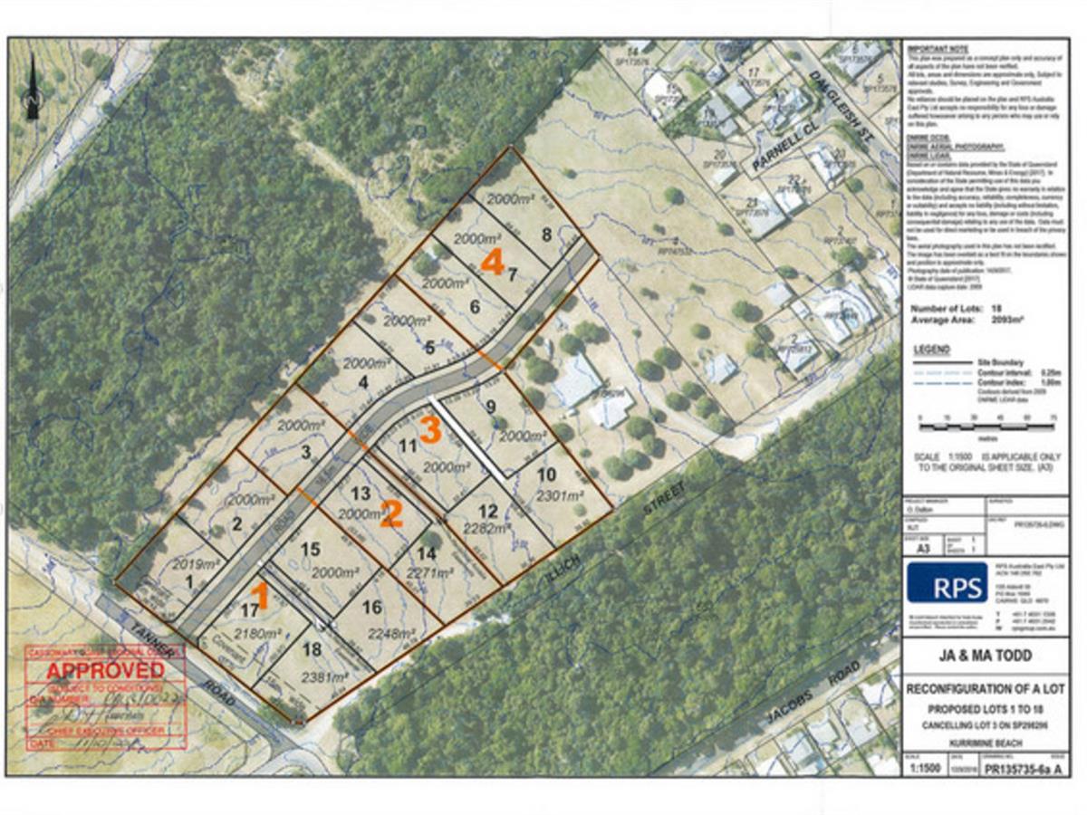 The existing DA (Development Approval) provides for a reconfiguration of the current single lot into 18 new allotments, with a new trunk road and sizes ranging from 2,000m2 to 2,381m2 - ideally suited to the lifestyle aspirations of this beachside suburb and those seeking room for a residence, shed and more.